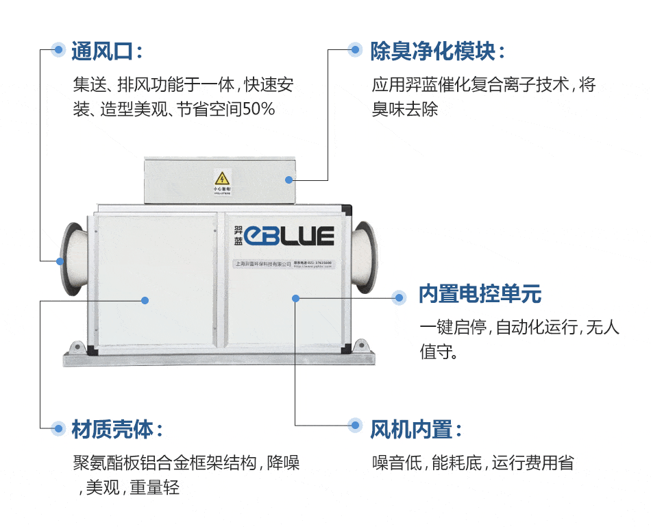 負(fù)壓新風(fēng)除臭設(shè)備采用羿藍(lán)耦合離子催化模塊+空氣賦能模塊,起到負(fù)壓新風(fēng)置換,去除臭味的效果,從而改善環(huán)境。